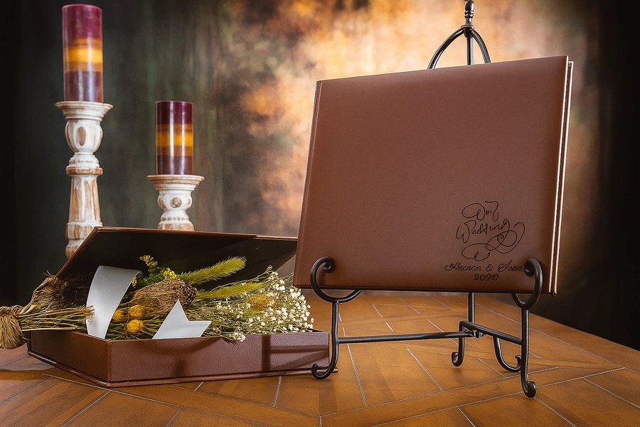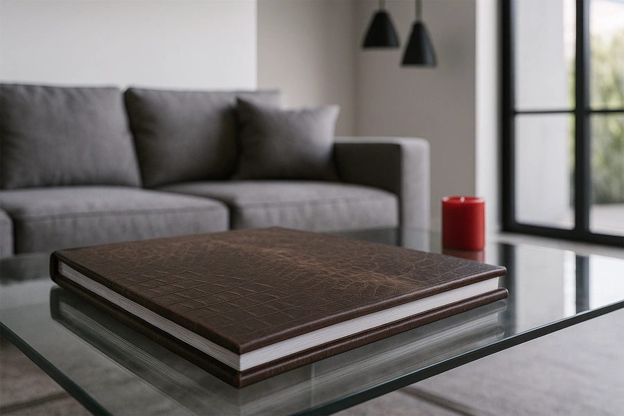 Mi Album presenta un fotobook artesanal con empastado en pro-piel lisa y bordes tallados tipo piedra. Su diseño transmite lujo, carácter y un sentido de historia perdurable. Perfecto para conservar recuerdos familiares, empresariales o de bodas con elegancia.