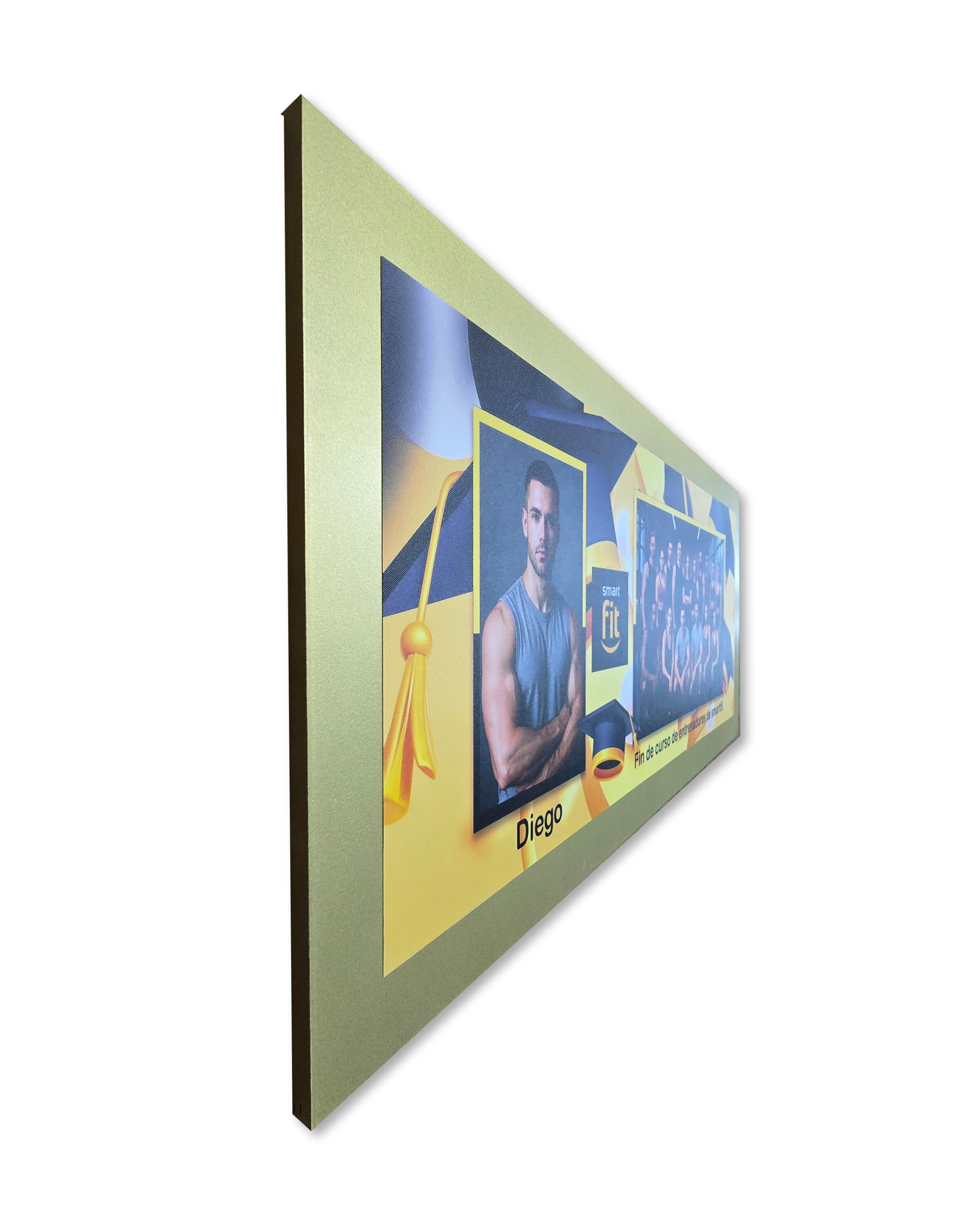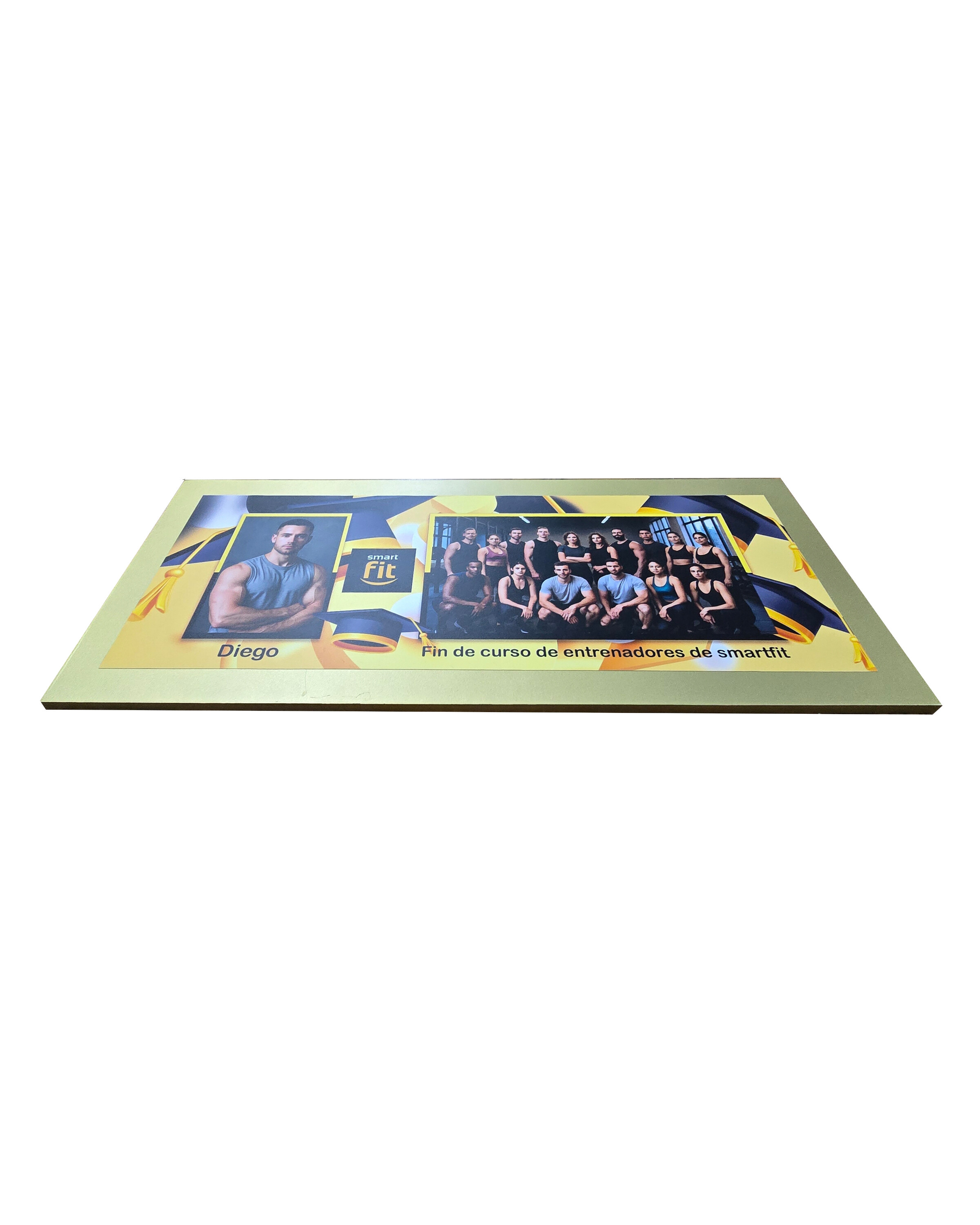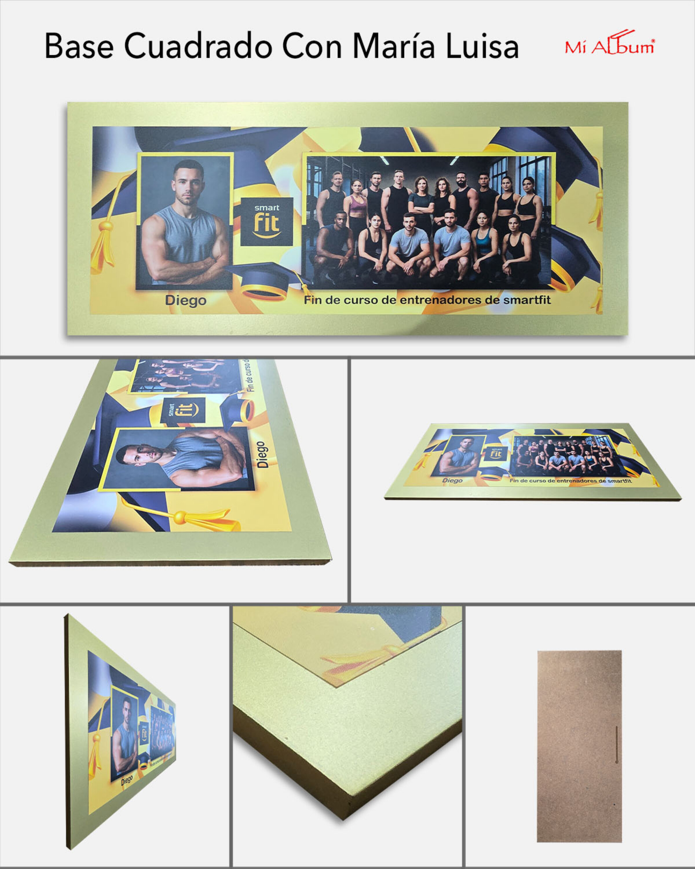 Base cuadrada con margen tipo María Luisa que aporta profundidad y una presentación más elegante. La fotografía central se enmarca con un borde personalizable que permite resaltar la imagen y dar mayor presencia al cuadro. Disponible en varios colores y con opción de textura para producción más rápida o poliéster para un acabado brillante, es una excelente opción para proyectos escolares que buscan un resultado más formal y atractivo.